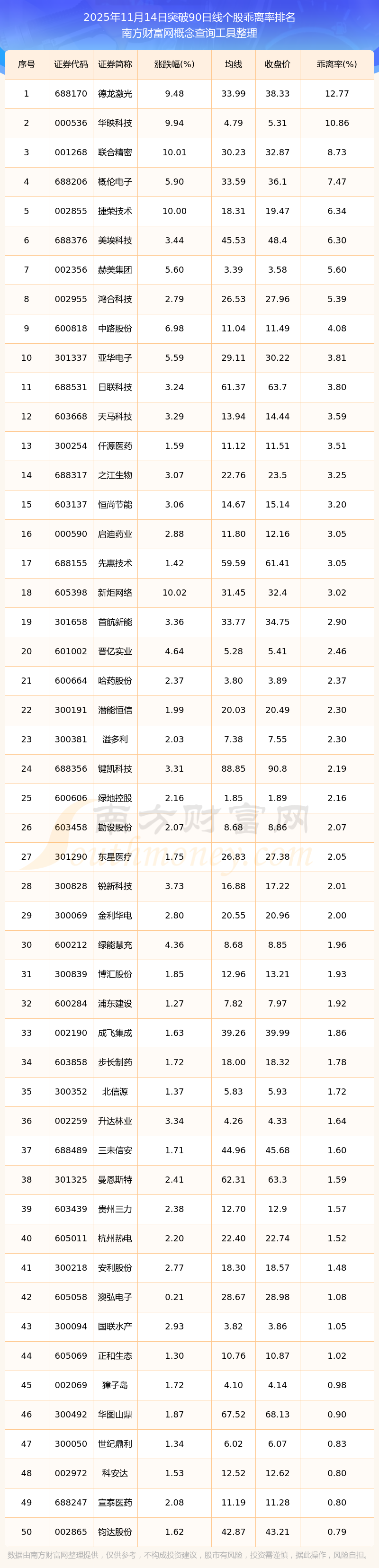 2025年11月14日突破90日线个股乖离率排名