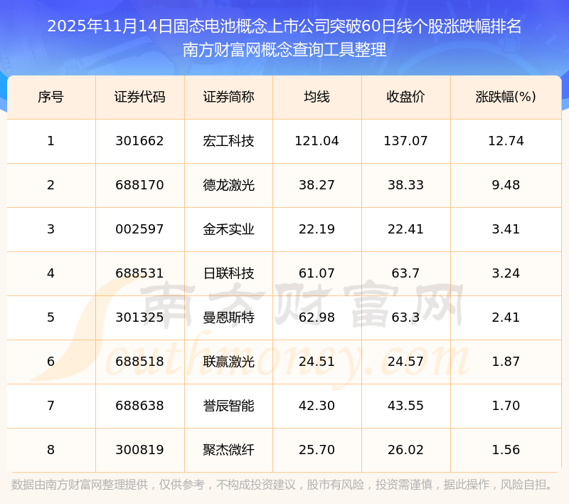 根据开云手机web版登录入口概念查询工具数据统计,截止2025年11月14日收盘,固态电池概念上市公司共有8只个股收盘价向上突破了60日线。其中涨幅较大的个股有宏工科技、德龙激光、金禾实业等,涨幅分别为12.74%、9.48%、3.41%。