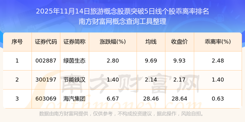 根据开云手机web版登录入口概念查询工具数据统计,截止2025年11月14日收盘,旅游概念股票共有3只个股收盘价向上突破了5日线。其中乖离率较大的个股有绿茵生态、节能铁汉、海汽集团等,乖离率分别为2.48%、1.40%、0.63%。