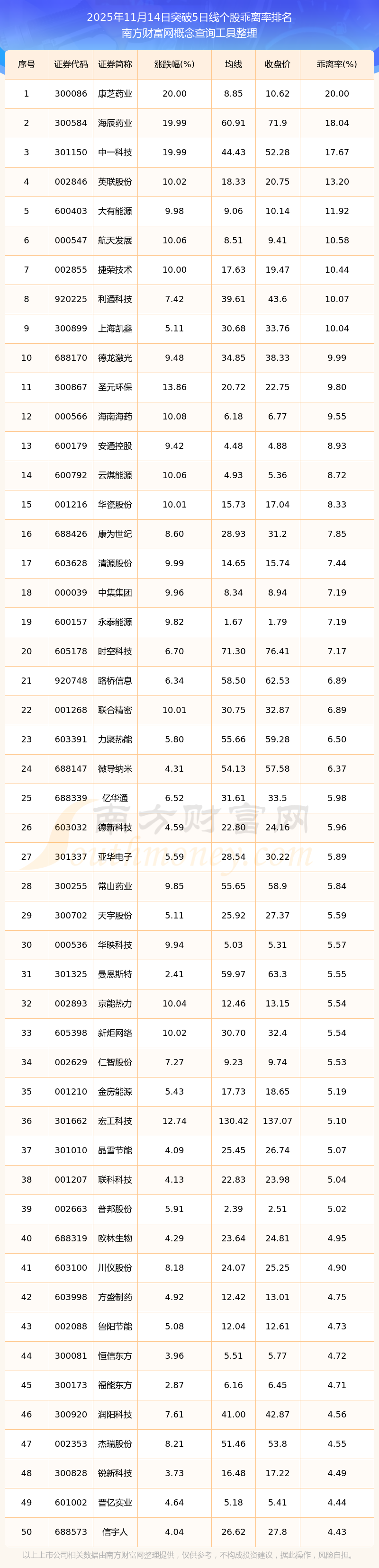 2025年11月14日突破5日线个股乖离率排名