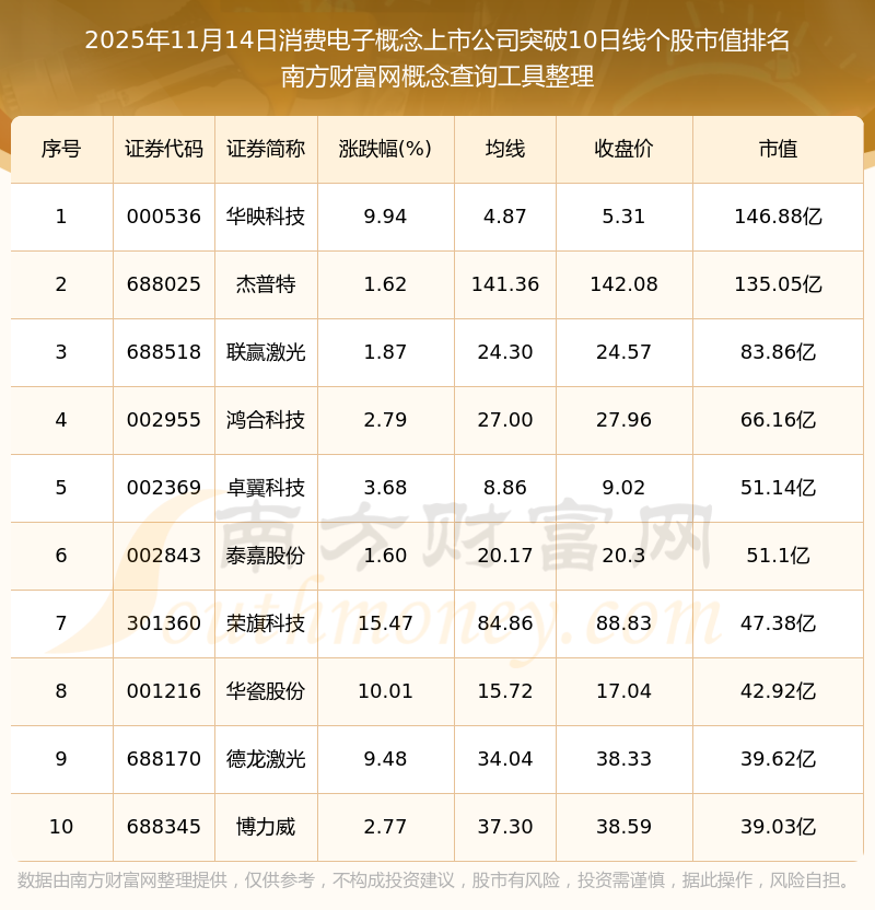 2025年11月14日消费电子概念上市公司突破10日线个股市值排名