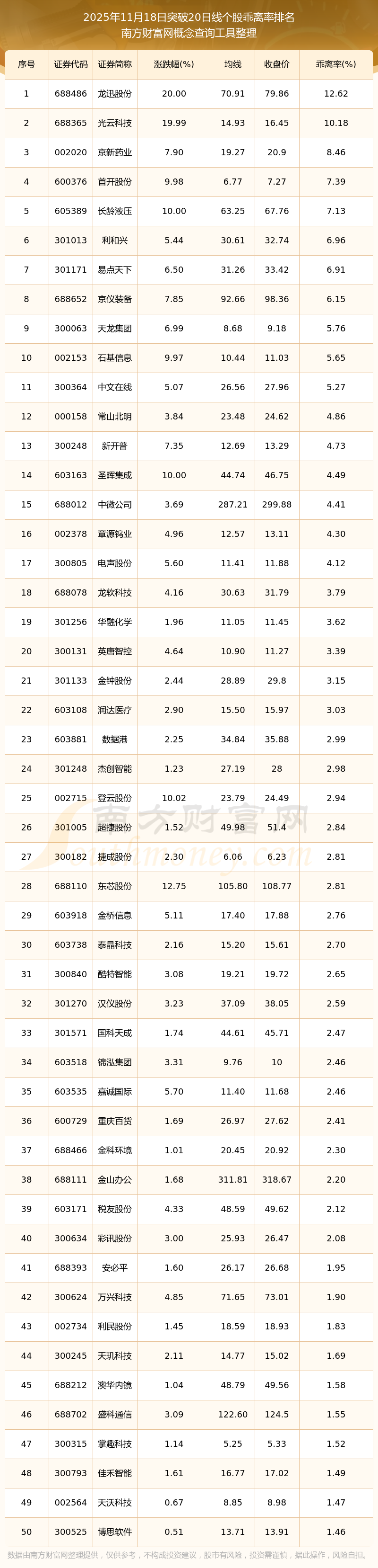 根据开云手机web版登录入口概念查询工具数据统计,截止2025年11月18日收盘,共有82只个股收盘价向上突破了20日线,其中乖离率较大的个股有龙迅股份、光云科技、京新药业、首开股份、长龄液压等,乖离率分别为12.62%、10.18%、8.46%、7.39%、7.13%。 2025年11月18日突破2