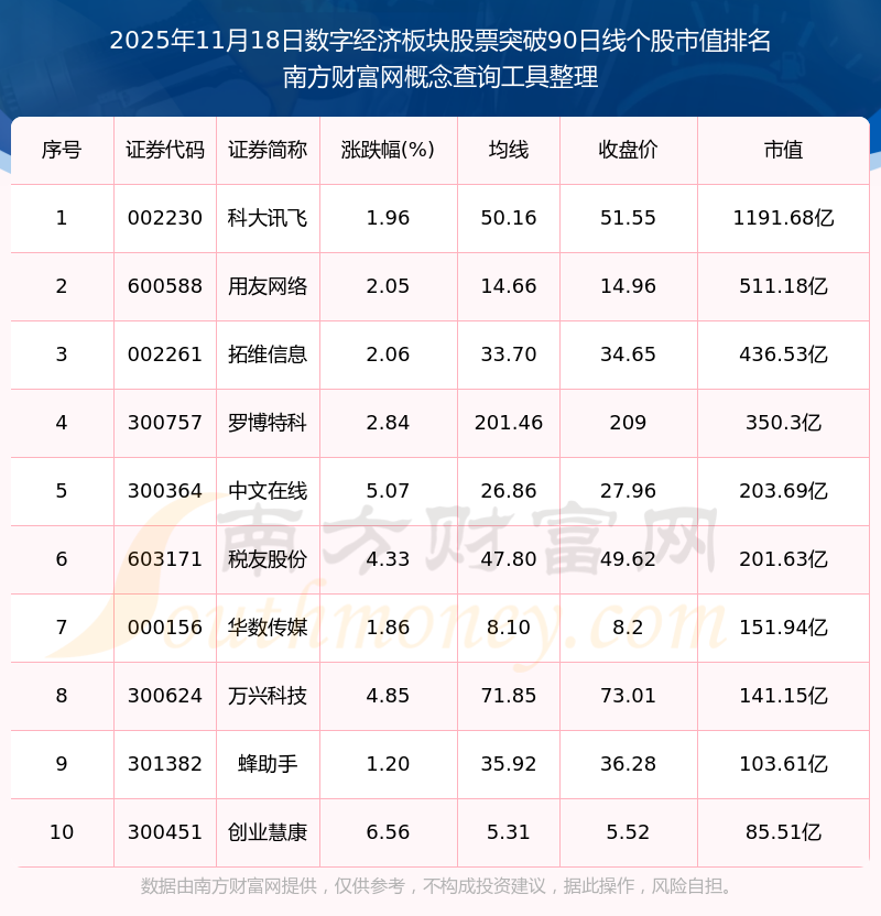 根据开云手机web版登录入口概念查询工具数据统计,截止2025年11月18日收盘,数字经济板块股票共有17只个股收盘价向上突破了90日线。其中市值较大的个股有科大讯飞、用友网络、拓维信息等,市值分别为1191.68亿、511.18亿、436.53亿。