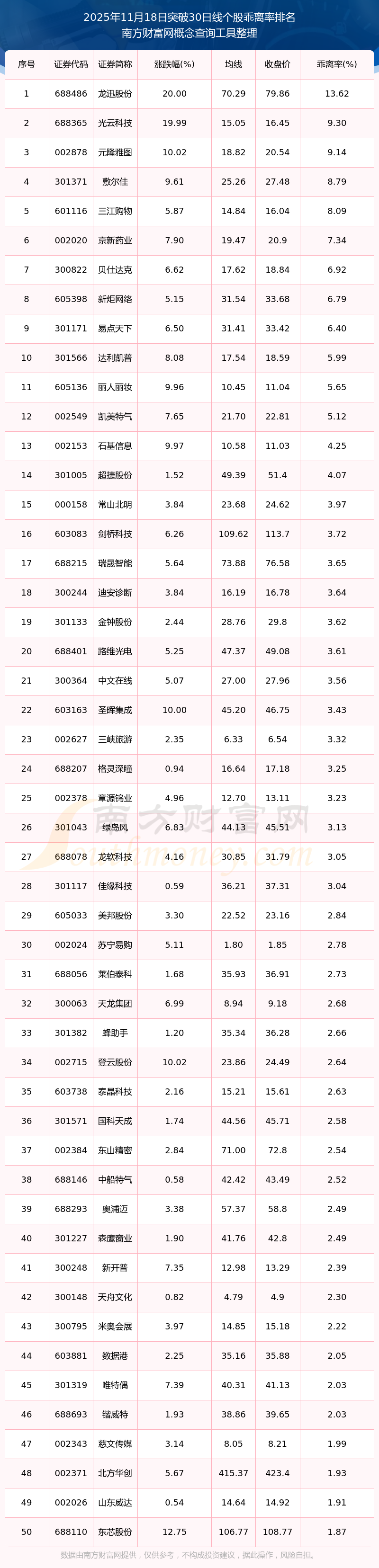 2025年11月18日突破30日线个股乖离率排名