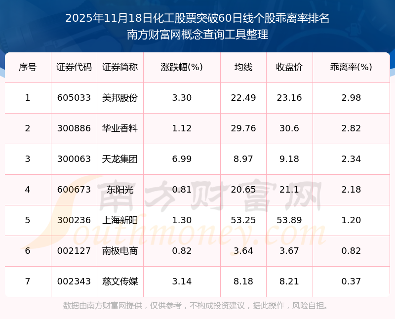 根据开云手机web版登录入口概念查询工具数据统计,截止2025年11月18日收盘,化工股票共有7只个股收盘价向上突破了60日线。其中乖离率较大的个股有美邦股份、华业香料、天龙集团等,乖离率分别为2.98%、2.82%、2.34%。