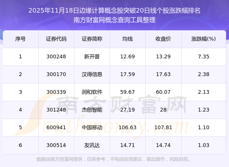 根据开云手机web版登录入口概念查询工具数据统计,截止2025年11月18日收盘,边缘计算概念股共有6只个股收盘价向上突破了20日线。其中涨幅较大的个股有新开普、汉得信息、润和软件等,涨幅分别为7.35%、2.38%、2.13%。