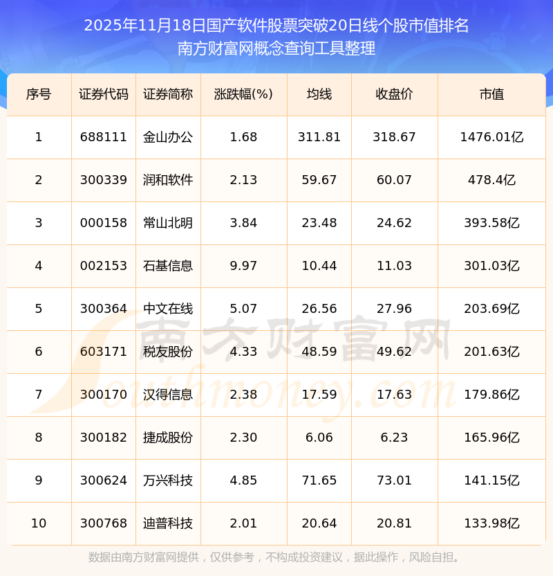 2025年11月18日国产软件股票突破20日线个股市值排名