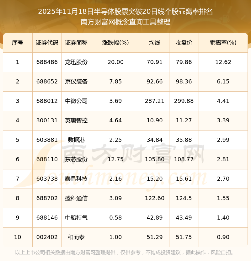 2025年11月18日半导体股票突破20日线个股乖离率排名