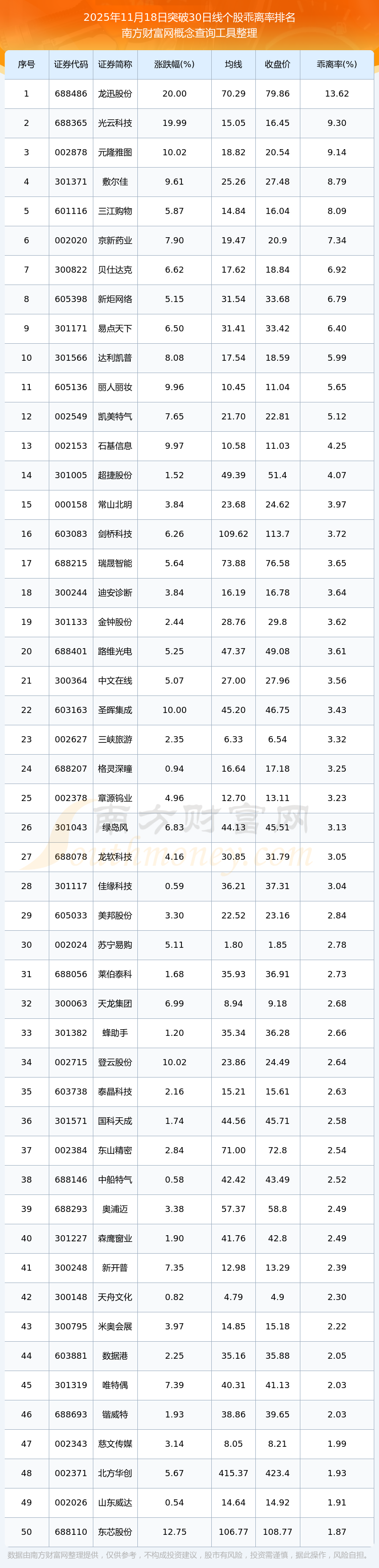 2025年11月18日突破30日线个股乖离率排名