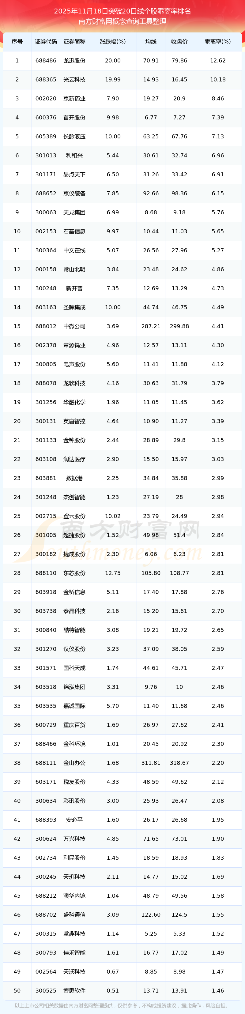 2025年11月18日突破20日线个股乖离率排名