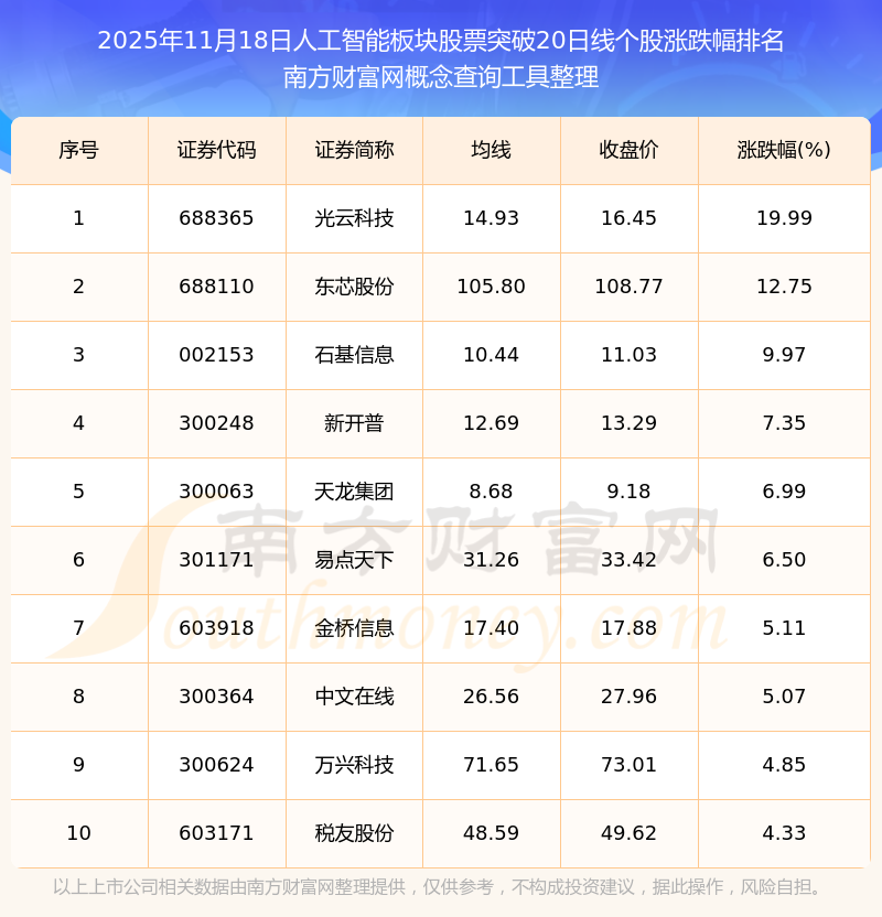 根据开云手机web版登录入口概念查询工具数据统计,截止2025年11月18日收盘,人工智能板块股票共有37只个股收盘价向上突破了20日线。其中涨幅较大的个股有光云科技、东芯股份、石基信息等,涨幅分别为19.99%、12.75%、9.97%。