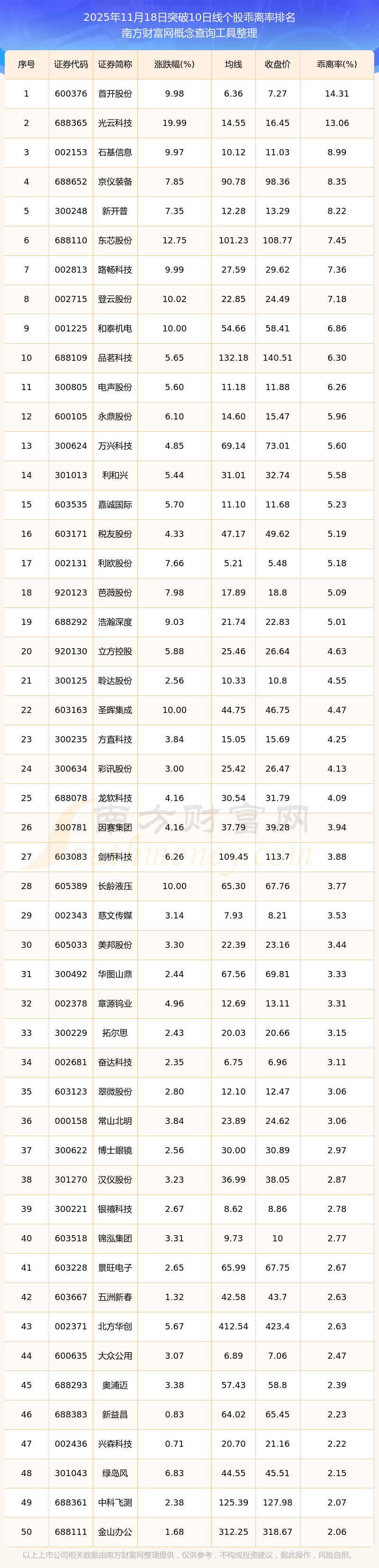 2025年11月18日突破10日线个股乖离率排名