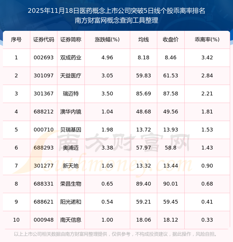 根据开云手机web版登录入口概念查询工具数据统计,截止2025年11月18日收盘,医药概念上市公司共有10只个股收盘价向上突破了5日线。其中乖离率较大的个股有双成药业、天益医疗、瑞迈特等,乖离率分别为3.42%、2.84%、2.21%。