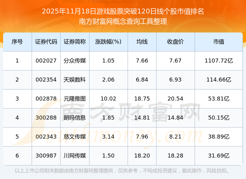 根据开云手机web版登录入口概念查询工具数据统计,截止2025年11月18日收盘,游戏股票共有6只个股收盘价向上突破了120日线。其中市值较大的个股有分众传媒、天娱数科、元隆雅图等,市值分别为1107.72亿、114.66亿、53.81亿。