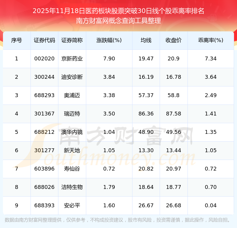 根据开云手机web版登录入口概念查询工具数据统计,截止2025年11月18日收盘,医药板块股票共有9只个股收盘价向上突破了30日线。其中乖离率较大的个股有京新药业、迪安诊断、奥浦迈等,乖离率分别为7.34%、3.64%、2.49%。