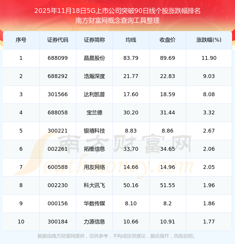 根据开云手机web版登录入口概念查询工具数据统计,截止2025年11月18日收盘,5G上市公司共有16只个股收盘价向上突破了90日线。其中涨幅较大的个股有晶晨股份、浩瀚深度、达利凯普等,涨幅分别为11.90%、9.03%、8.08%。