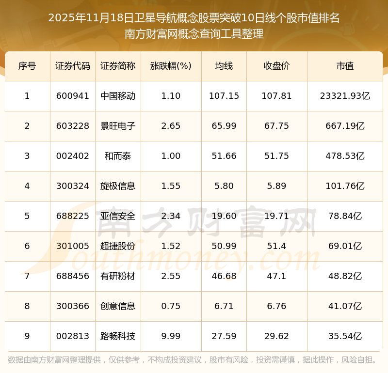 2025年11月18日卫星导航概念股票突破10日线个股市值排名