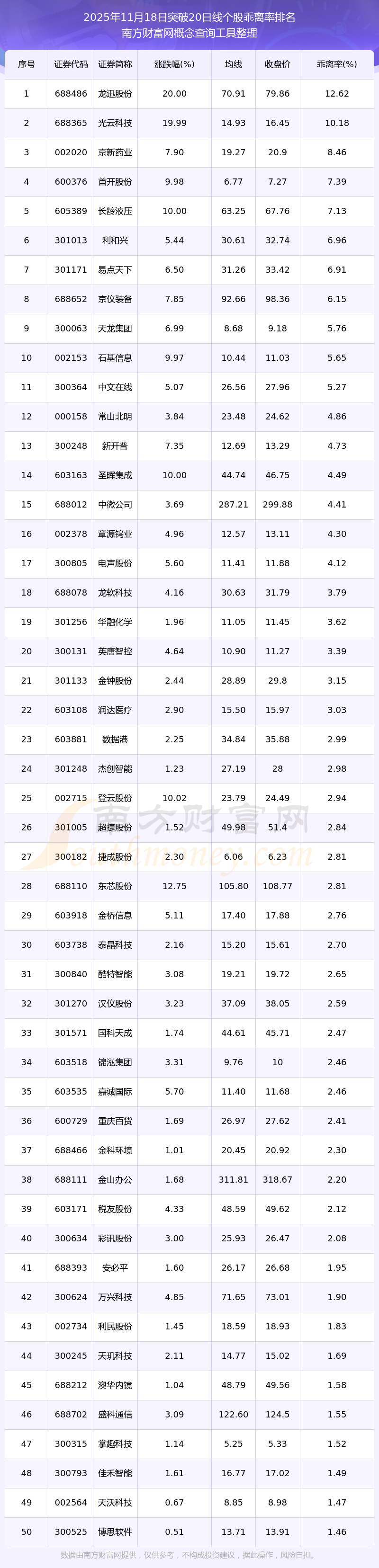 根据开云手机web版登录入口概念查询工具数据统计,截止2025年11月18日收盘,共有82只个股收盘价向上突破了20日线,其中乖离率较大的个股有龙迅股份、光云科技、京新药业、首开股份、长龄液压等,乖离率分别为12.62%、10.18%、8.46%、7.39%、7.13%。 2025年11月18日突破2