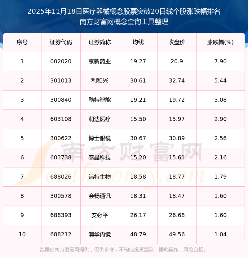 根据开云手机web版登录入口概念查询工具数据统计,截止2025年11月18日收盘,医疗器械概念股票共有10只个股收盘价向上突破了20日线。其中涨幅较大的个股有京新药业、利和兴、酷特智能等,涨幅分别为7.90%、5.44%、3.08%。
