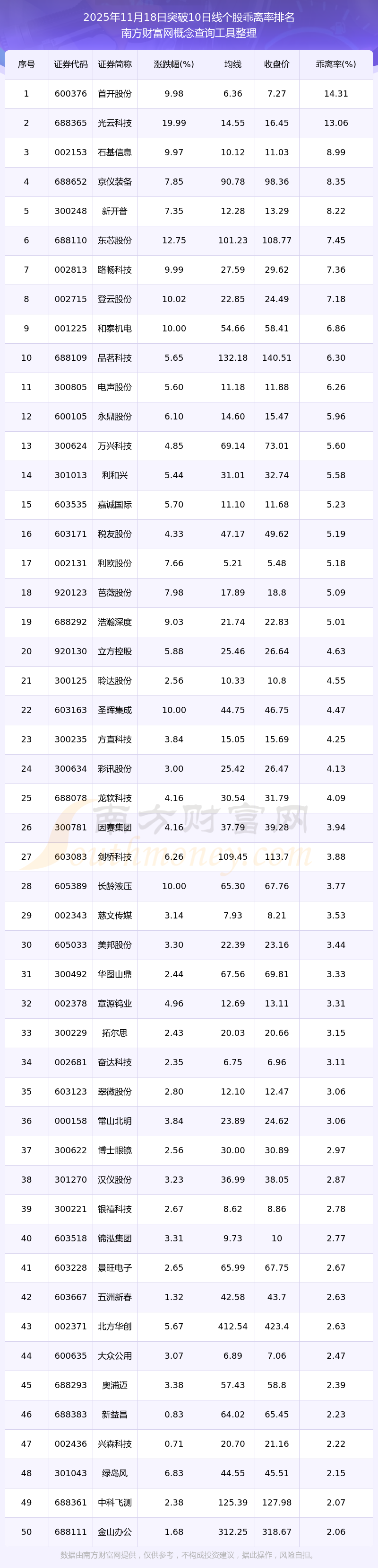 根据开云手机web版登录入口概念查询工具数据统计,截止2025年11月18日收盘,共有122只个股收盘价向上突破了10日线,其中乖离率较大的个股有首开股份、光云科技、石基信息、京仪装备、新开普等,乖离率分别为14.31%、13.06%、8.99%、8.35%、8.22%。 2025年11月18日突破10