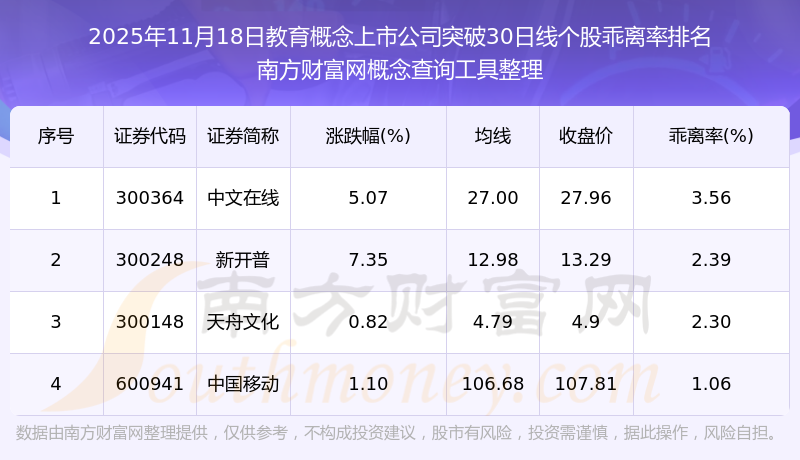 2025年11月18日教育概念上市公司突破30日线个股乖离率排名