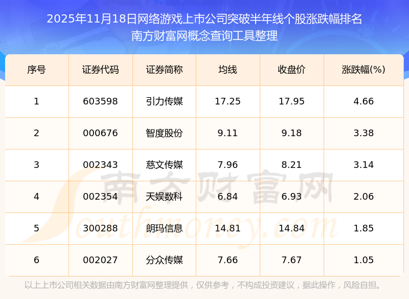 根据开云手机web版登录入口概念查询工具数据统计,截止2025年11月18日收盘,网络游戏上市公司共有6只个股收盘价向上突破了半年线。其中涨幅较大的个股有引力传媒、智度股份、慈文传媒等,涨幅分别为4.66%、3.38%、3.14%。