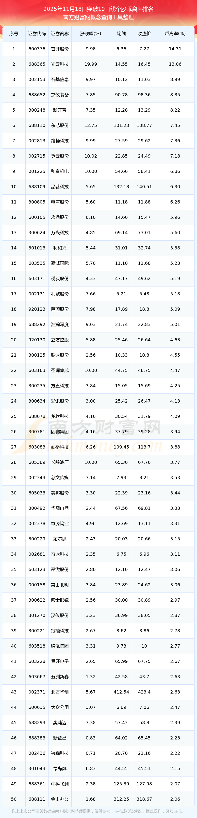 2025年11月18日突破10日线个股乖离率排名
