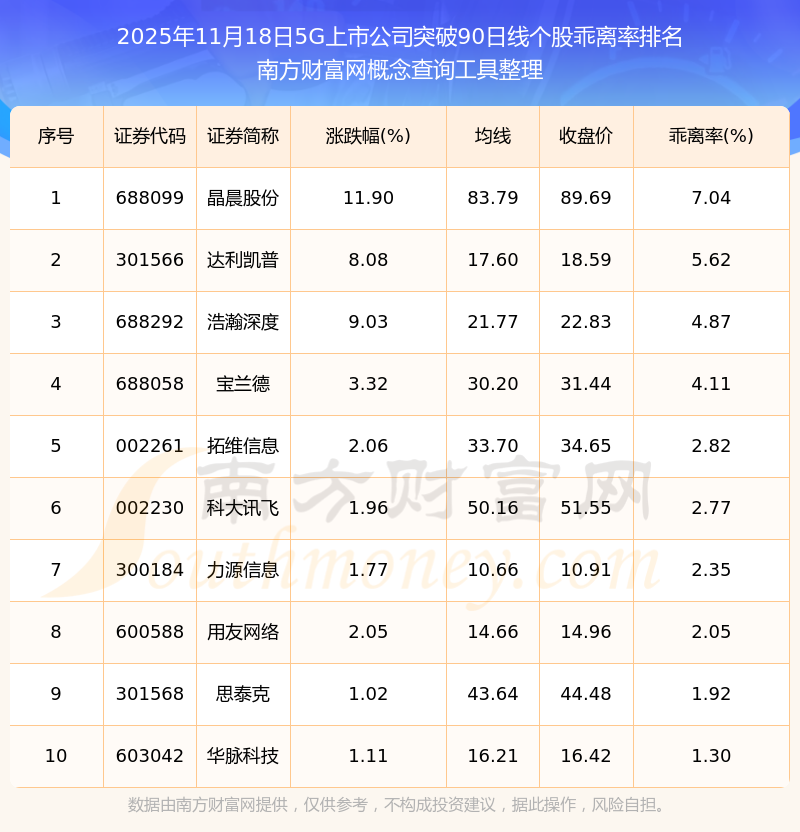 根据开云手机web版登录入口概念查询工具数据统计,截止2025年11月18日收盘,5G上市公司共有16只个股收盘价向上突破了90日线。其中乖离率较大的个股有晶晨股份、达利凯普、浩瀚深度等,乖离率分别为7.04%、5.62%、4.87%。