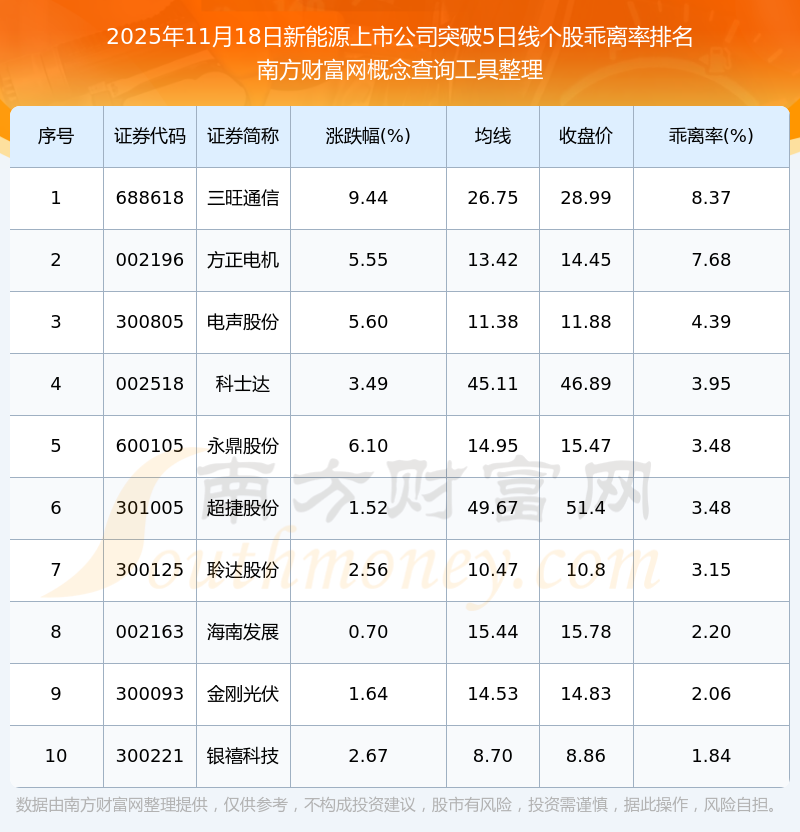 2025年11月18日新能源上市公司突破5日线个股乖离率排名