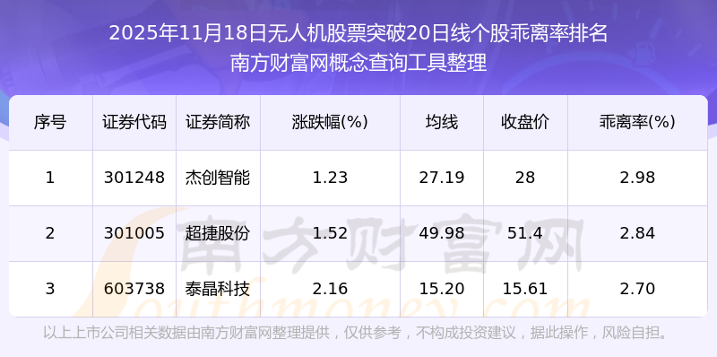 根据开云手机web版登录入口概念查询工具数据统计,截止2025年11月18日收盘,无人机股票共有3只个股收盘价向上突破了20日线。其中乖离率较大的个股有杰创智能、超捷股份、泰晶科技等,乖离率分别为2.98%、2.84%、2.70%。