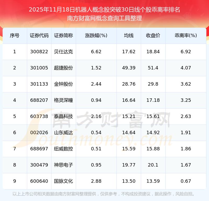 2025年11月18日机器人概念股突破30日线个股乖离率排名