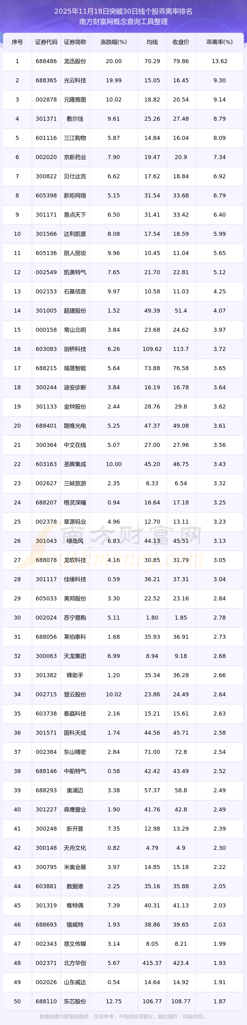 根据开云手机web版登录入口概念查询工具数据统计,截止2025年11月18日收盘,共有101只个股收盘价向上突破了30日线,其中乖离率较大的个股有龙迅股份、光云科技、元隆雅图、敷尔佳、三江购物等,乖离率分别为13.62%、9.30%、9.14%、8.79%、8.09%。