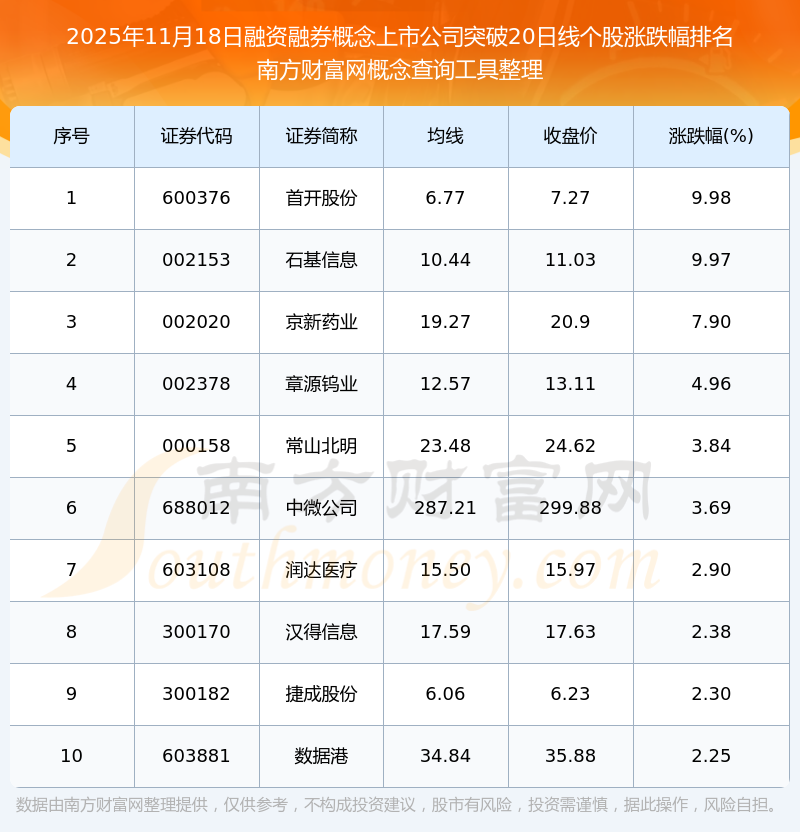 2025年11月18日融资融券概念上市公司突破20日线个股涨跌幅排名