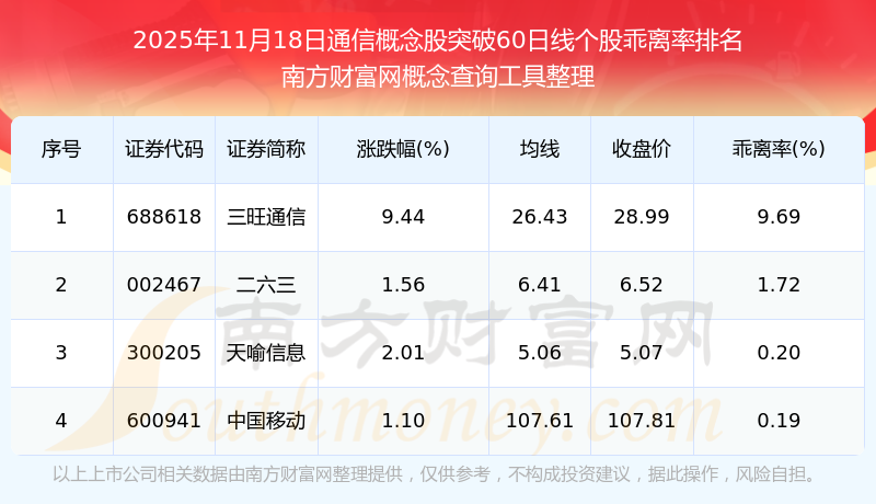 根据开云手机web版登录入口概念查询工具数据统计,截止2025年11月18日收盘,通信概念股共有4只个股收盘价向上突破了60日线。其中乖离率较大的个股有三旺通信、二六三、天喻信息等,乖离率分别为9.69%、1.72%、0.20%。