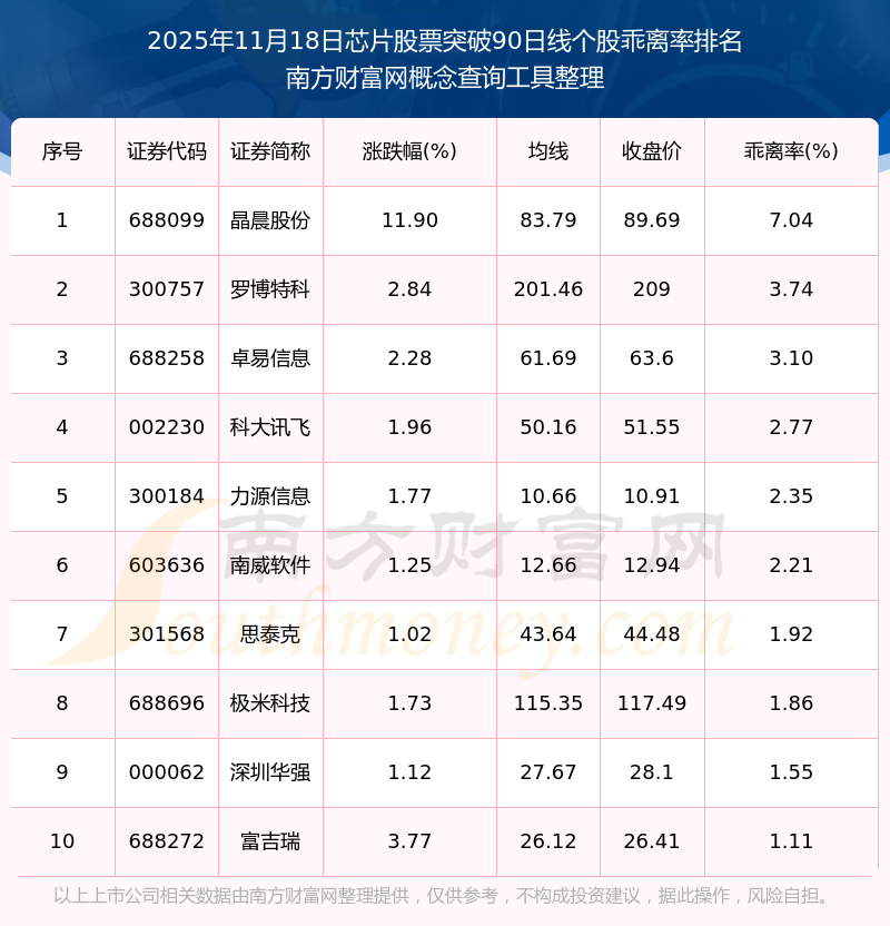 2025年11月18日芯片股票突破90日线个股乖离率排名