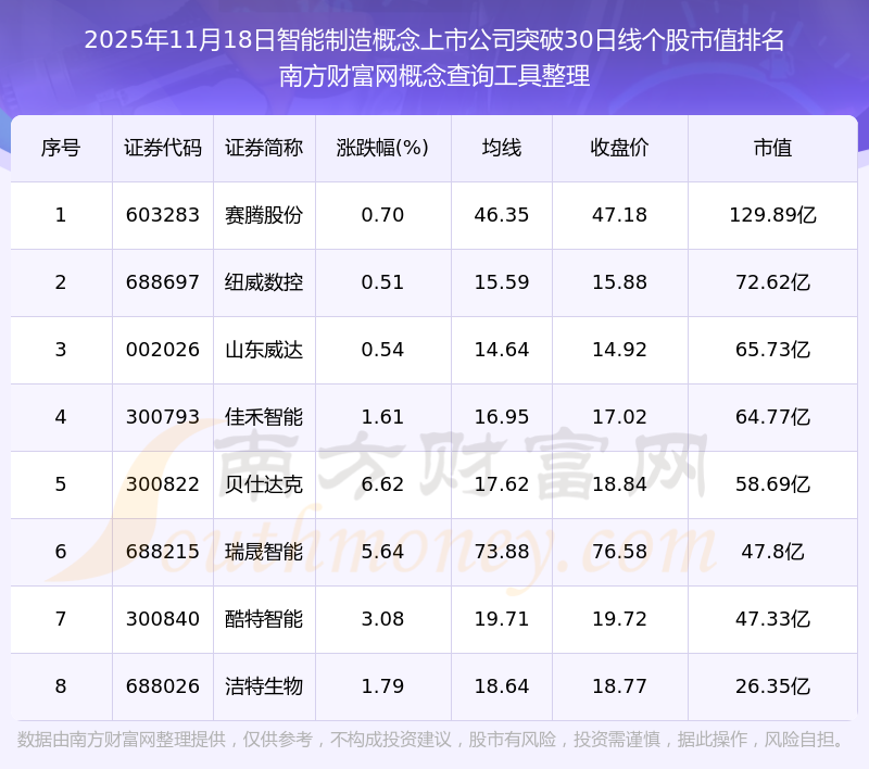 2025年11月18日智能制造概念上市公司突破30日线个股市值排名
