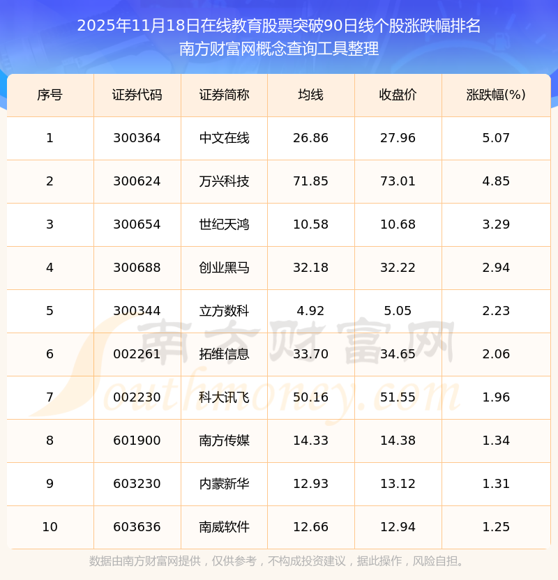 2025年11月18日在线教育股票突破90日线个股涨跌幅排名