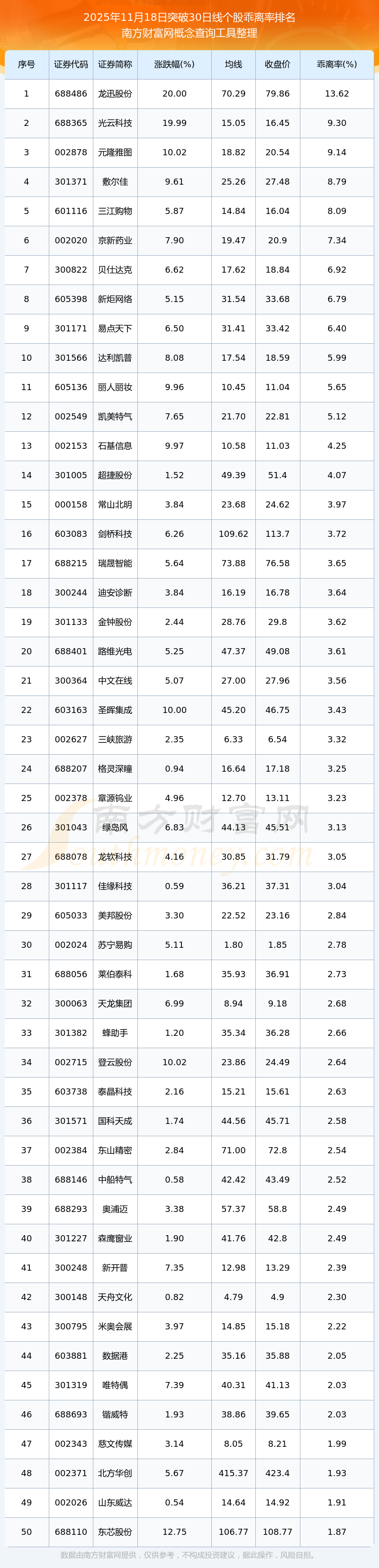 根据开云手机web版登录入口概念查询工具数据统计,截止2025年11月18日收盘,共有101只个股收盘价向上突破了30日线,其中乖离率较大的个股有龙迅股份、光云科技、元隆雅图、敷尔佳、三江购物等,乖离率分别为13.62%、9.30%、9.14%、8.79%、8.09%。