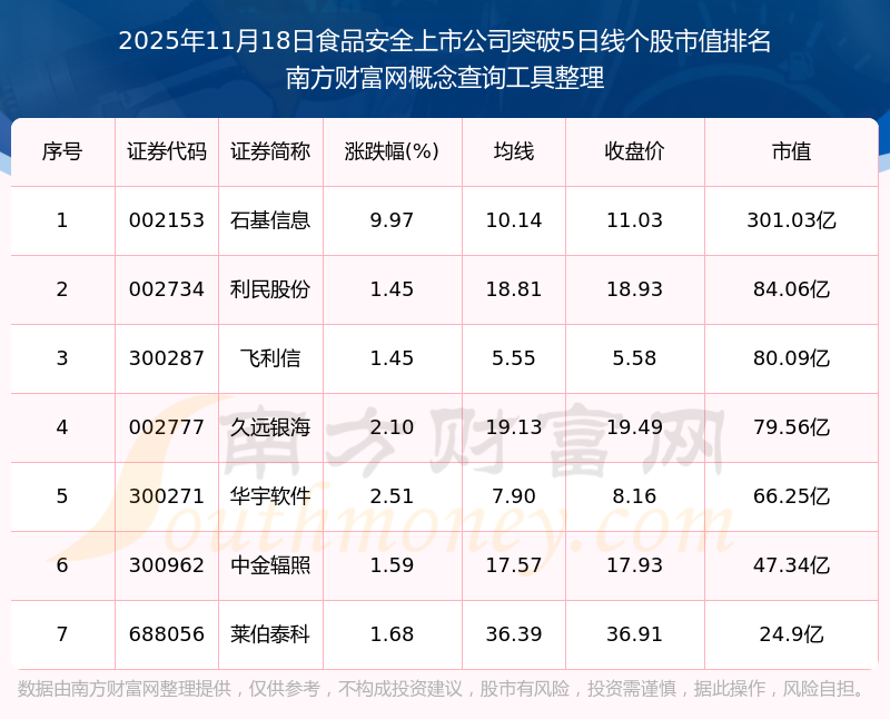 2025年11月18日食品安全上市公司突破5日线个股市值排名