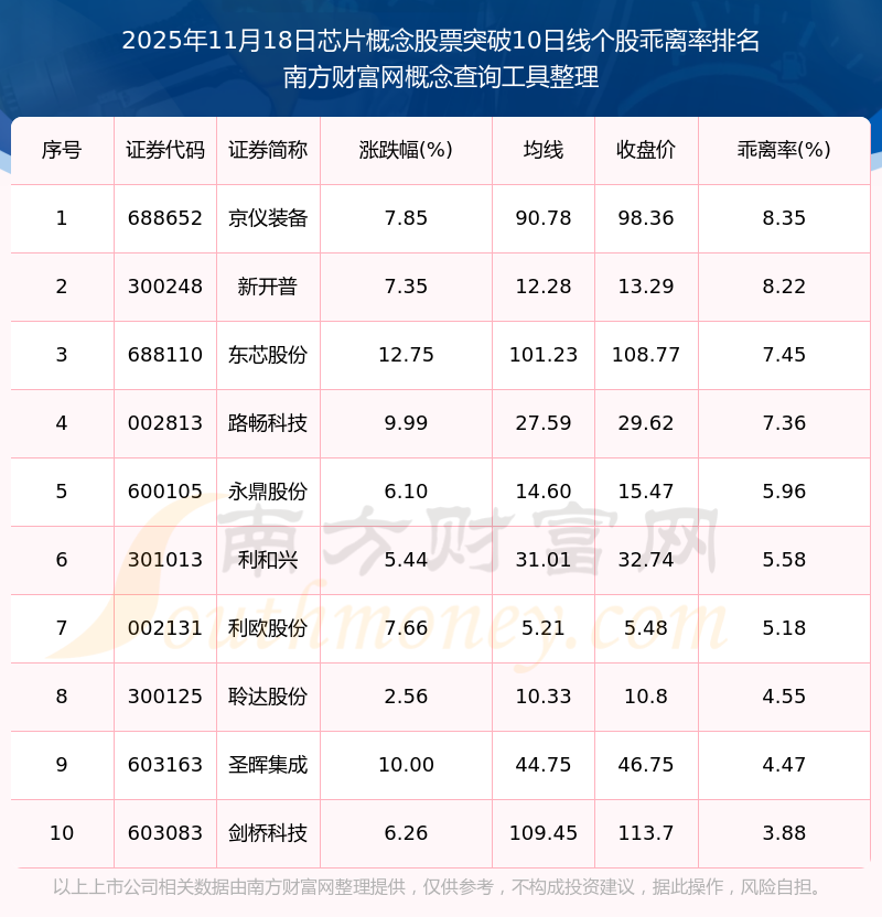 根据开云手机web版登录入口概念查询工具数据统计,截止2025年11月18日收盘,芯片概念股票共有40只个股收盘价向上突破了10日线。其中乖离率较大的个股有京仪装备、新开普、东芯股份等,乖离率分别为8.35%、8.22%、7.45%。