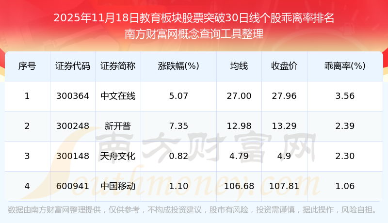 根据开云手机web版登录入口概念查询工具数据统计,截止2025年11月18日收盘,教育板块股票共有4只个股收盘价向上突破了30日线。其中乖离率较大的个股有中文在线、新开普、天舟文化等,乖离率分别为3.56%、2.39%、2.30%。