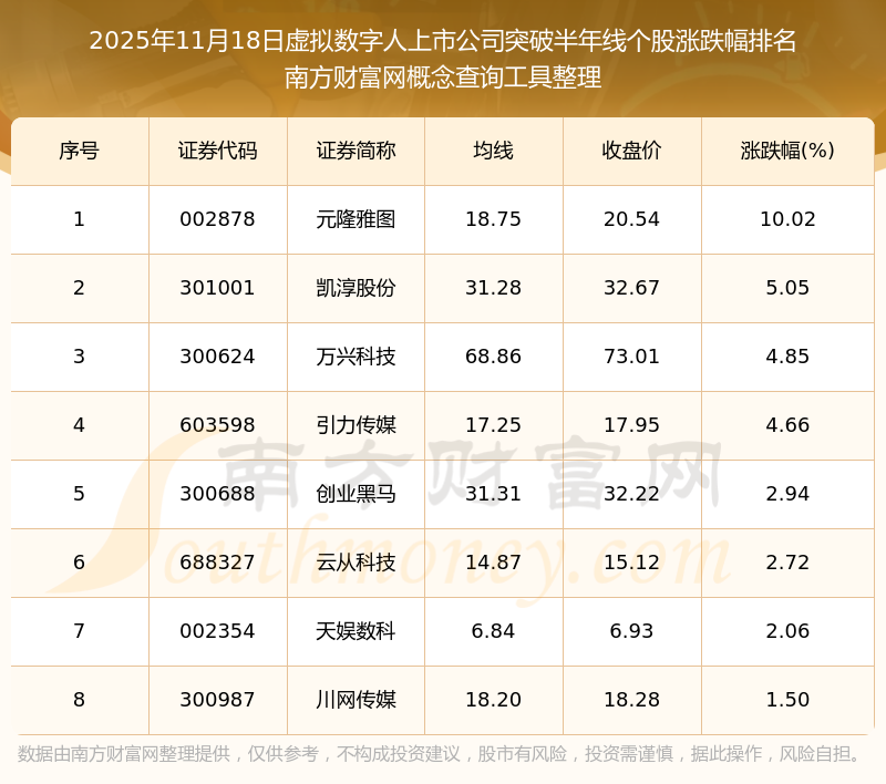 根据开云手机web版登录入口概念查询工具数据统计,截止2025年11月18日收盘,虚拟数字人上市公司共有8只个股收盘价向上突破了半年线。其中涨幅较大的个股有元隆雅图、凯淳股份、万兴科技等,涨幅分别为10.02%、5.05%、4.85%。