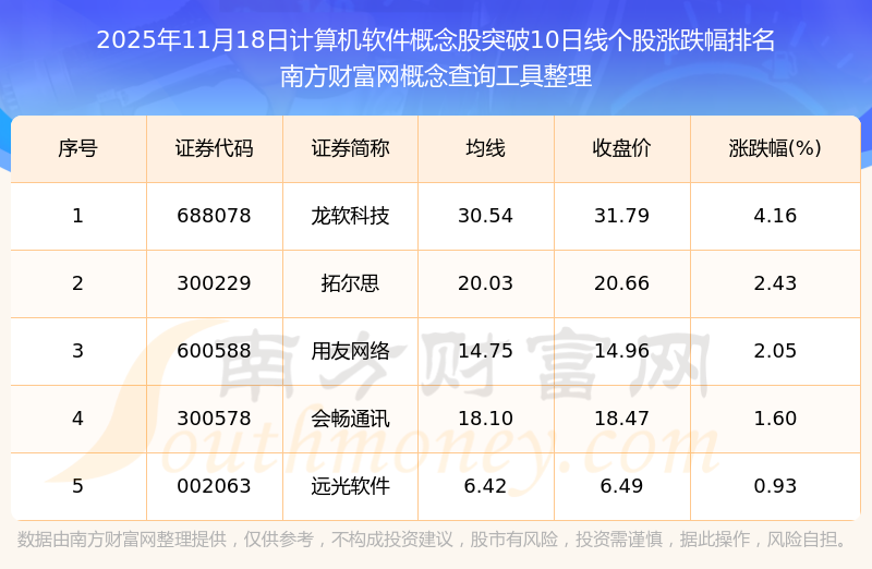 根据开云手机web版登录入口概念查询工具数据统计,截止2025年11月18日收盘,计算机软件概念股共有5只个股收盘价向上突破了10日线。其中涨幅较大的个股有龙软科技、拓尔思、用友网络等,涨幅分别为4.16%、2.43%、2.05%。