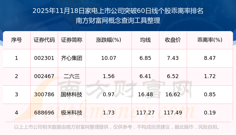 2025年11月18日家电上市公司突破60日线个股乖离率排名