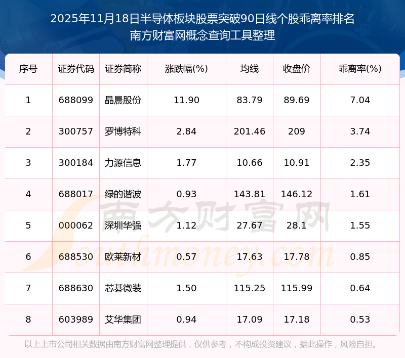 根据开云手机web版登录入口概念查询工具数据统计,截止2025年11月18日收盘,半导体板块股票共有8只个股收盘价向上突破了90日线。其中乖离率较大的个股有晶晨股份、罗博特科、力源信息等,乖离率分别为7.04%、3.74%、2.35%。