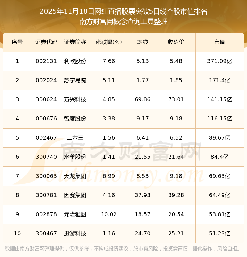 根据开云手机web版登录入口概念查询工具数据统计,截止2025年11月18日收盘,网红直播股票共有12只个股收盘价向上突破了5日线。其中市值较大的个股有利欧股份、苏宁易购、万兴科技等,市值分别为371.09亿、171.4亿、141.15亿。