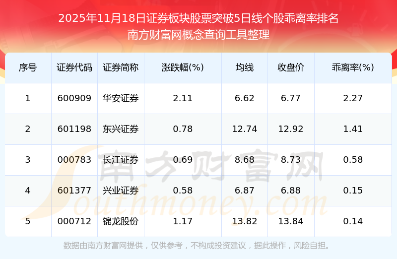根据开云手机web版登录入口概念查询工具数据统计,截止2025年11月18日收盘,证券板块股票共有5只个股收盘价向上突破了5日线。其中乖离率较大的个股有华安证券、东兴证券、长江证券等,乖离率分别为2.27%、1.41%、0.58%。