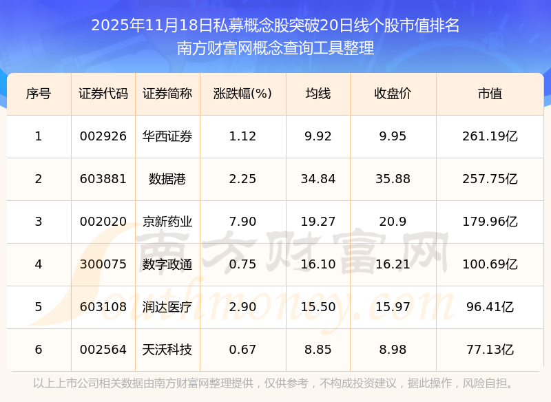 根据开云手机web版登录入口概念查询工具数据统计,截止2025年11月18日收盘,私募概念股共有6只个股收盘价向上突破了20日线。其中市值较大的个股有华西证券、数据港、京新药业等,市值分别为261.19亿、257.75亿、179.96亿。