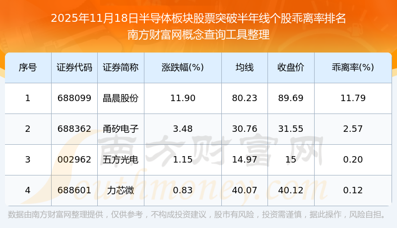 2025年11月18日半导体板块股票突破半年线个股乖离率排名
