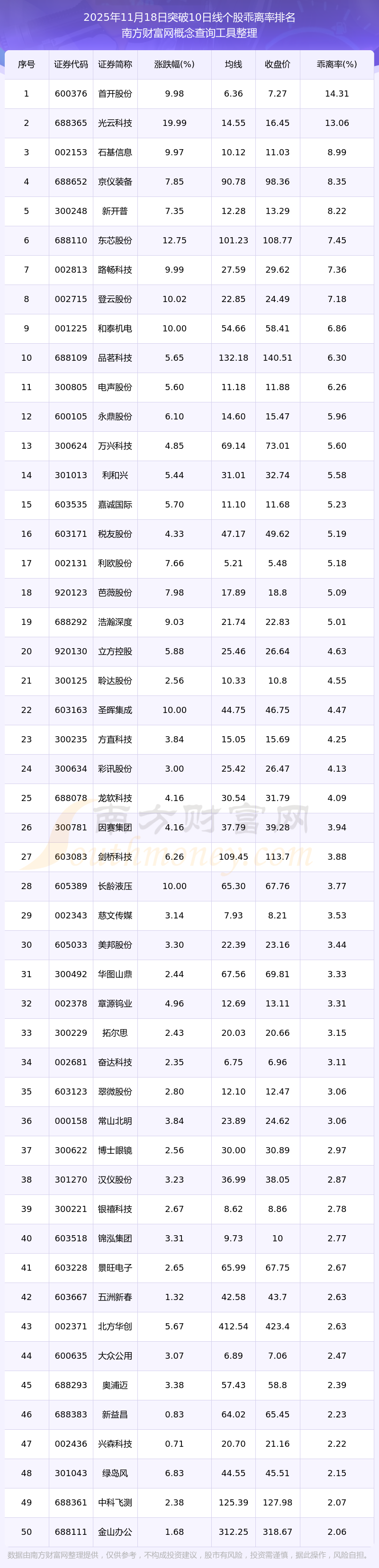 2025年11月18日突破10日线个股乖离率排名